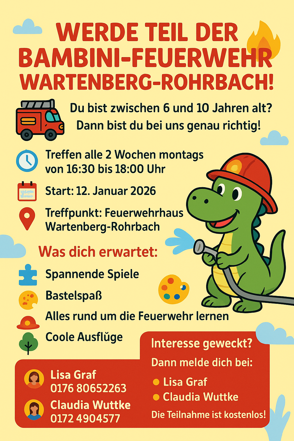 unsere Bambini- Gruppe verabschiedet sich zum 31.Dezember 2025. Nach vielen schönen Jahren voller Spiel, Spaß und Feuerwehr-Abendteuer endet unsere gemeinsame Zeit nun. Danke an alle Kinder, Eltern und Unterstützern für das Vertrauen, die Freude und unvergesslichen Momente. Auch wenn unsere Bambini-Gruppe nun aufhört, möchten wir euch ermutigen, weiterhin die spannende Welt der Feuerwehr zu entdecken. In unserer Region gibt es viele Kinderfeuerwehren, die sich über neugierige und mutige Nachwuchs-Feuerwehrleute freuen. In Imsbach und auch Münchweiler gibt es eine Bambini-Gruppe. Dort könnt ihr weiterhin lernen, spielen und Gemeinschaft erleben. Eure Bambini-Feuerwehr |